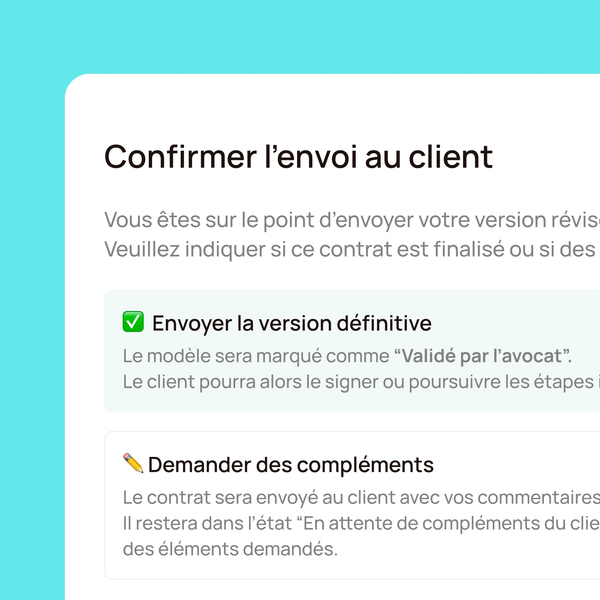 L'IA prépare les drafts sur la base de vos modèles. Vous intervenez là où votre expertise fait la différence — pas sur la mise en forme.